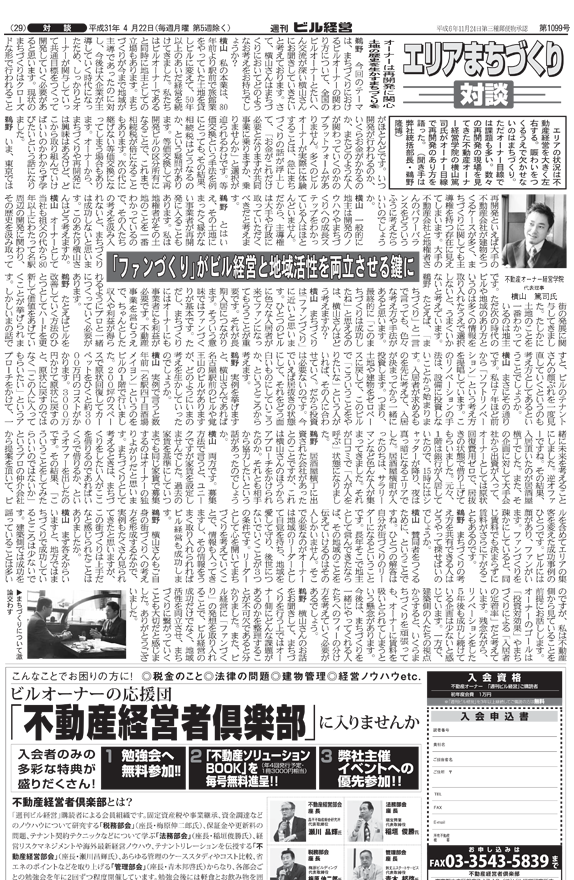 土地の歴史を活かす街づくりへ。再開発がすすむ日本において地権者やオーナーの立場からファンづくりや経営再構築に成功した事例のポイントを紹介しながら今後の街づくりに必要な在り方を共有。横山氏によるソフトリノベーションによって成功した「名駅4丁目酒場名メイヨン(2012)」や「LDK覚王山(2014)」などの企画構想から賛同者集めまで、地域活性につながるビルの再構築について紹介されました。